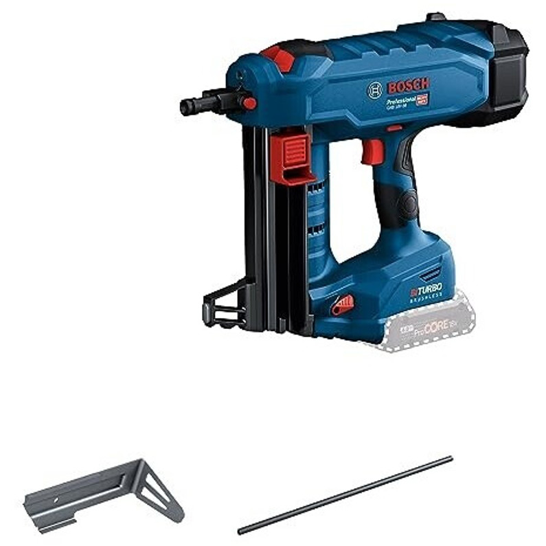Zum Lieferumfang gehören ein Ausdrückstift und ein Befestigungshaken. Ein Ladegerät ist nicht im Lieferumfang enthalten, da der Nagler Teil des flexiblen Bosch ProCORE Akkusystems ist und bestehende Akkus und Ladegeräte verwendet werden können.