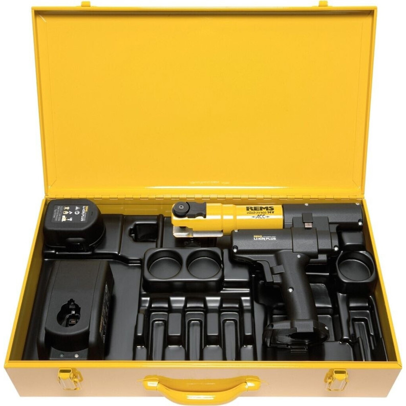 Das Gerät wird mit einem 14,4 V Akku betrieben und überzeugt durch seine kompakte Bauweise. Im Lieferumfang sind ein Schnellladegerät und ein praktischer Koffer enthalten, sodass Sie direkt mit der Arbeit beginnen können. Die Rems Mini-Press ACC Li-Ion ist eine Akku-Radialpresse mit Zwangsablauf und kann Pressverbindungen mit einem Durchmesser von 10 bis 40 mm herstellen.